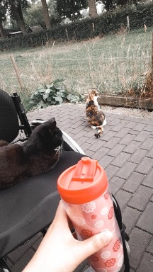 Het was grappig en bijzonder om te zien hoe de dieren moesten wennen aan mijn rolstoel. Mijn kat bijvoorbeeld vindt het heerlijk, want nu kan ze gewoon op schoot blijven liggen terwijl ik door het huis heen rol.